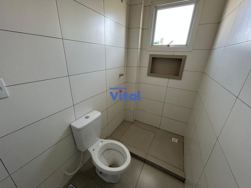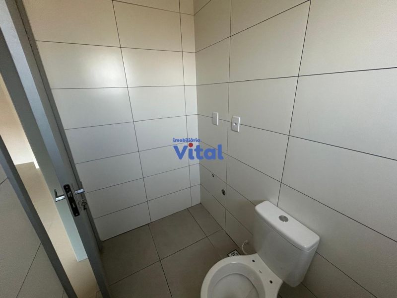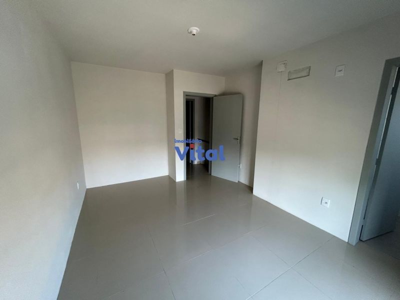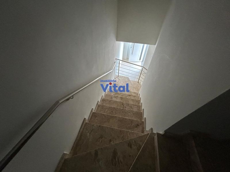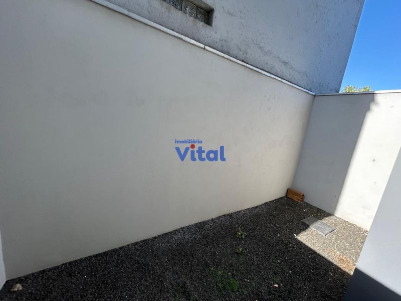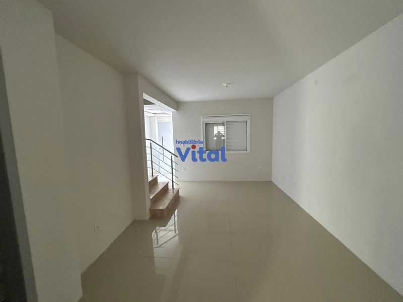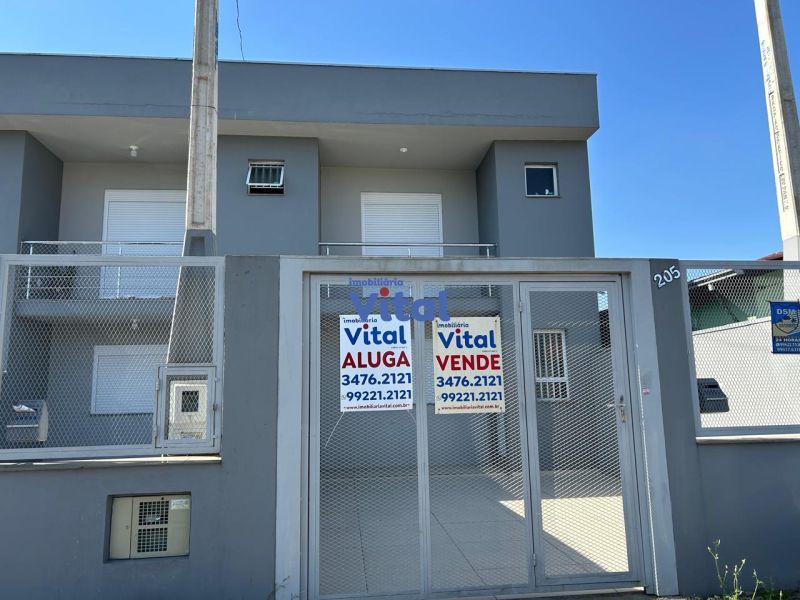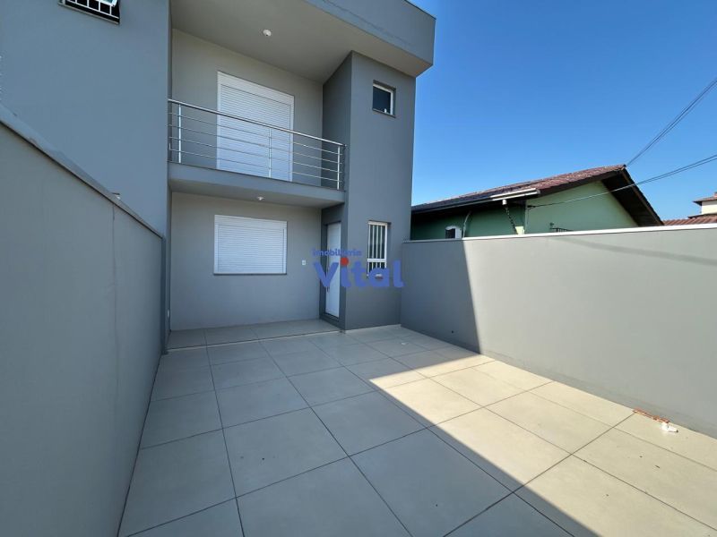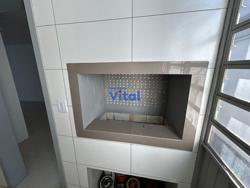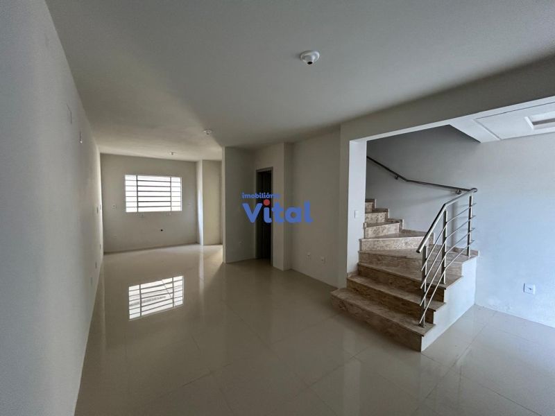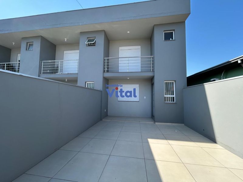 Casa/sobrado com dois dormitórios (ambos suítes), três banheiros (suítes e um social), sala, cozinha, churrasqueira, área de serviços e espaço pequeno nos fundos.