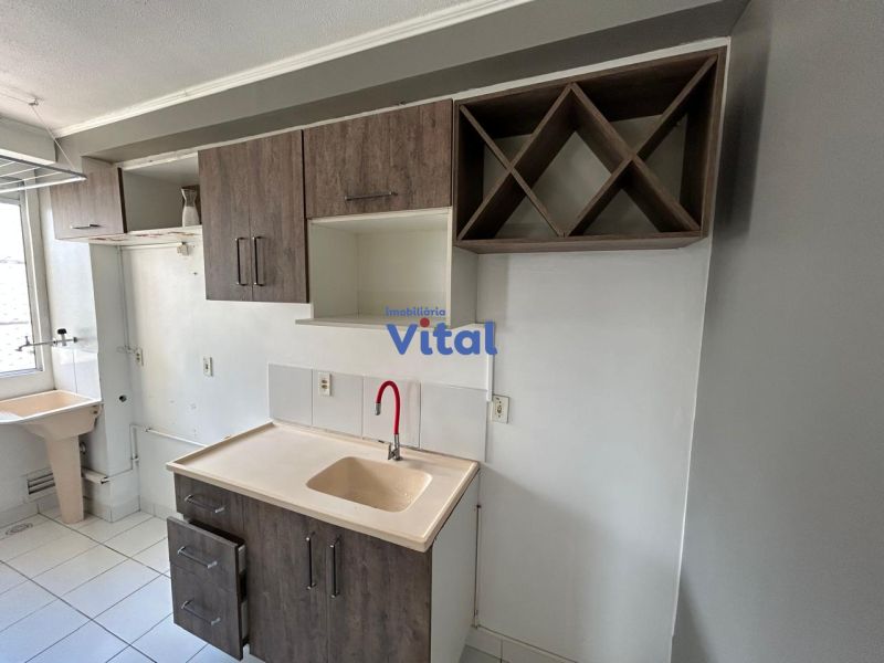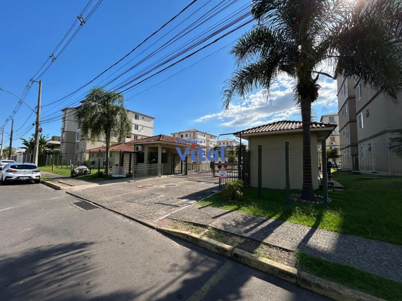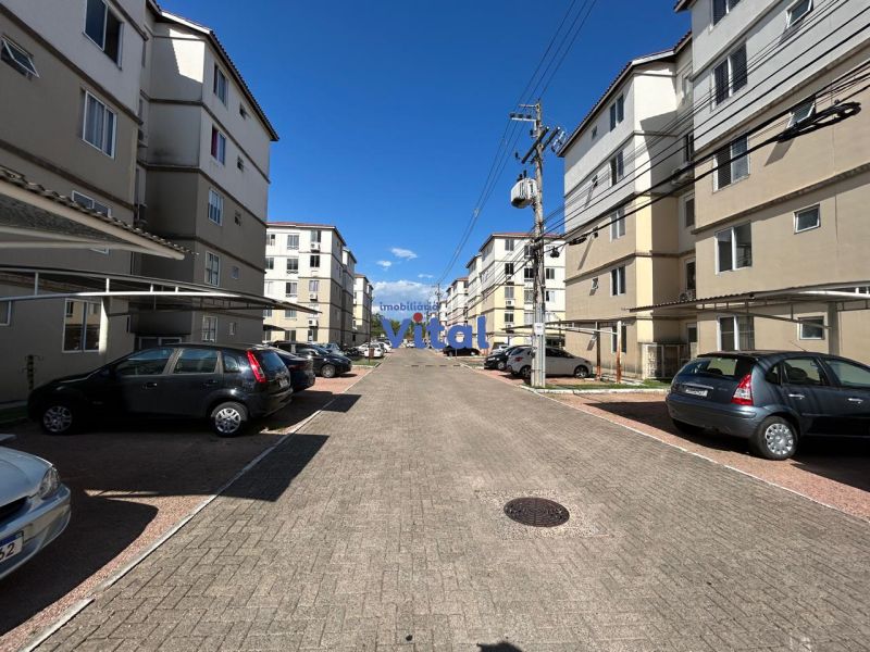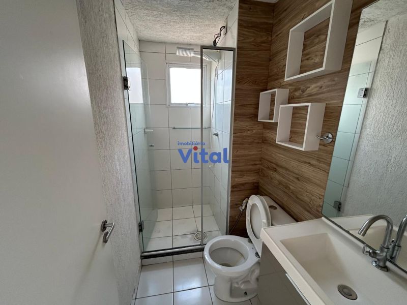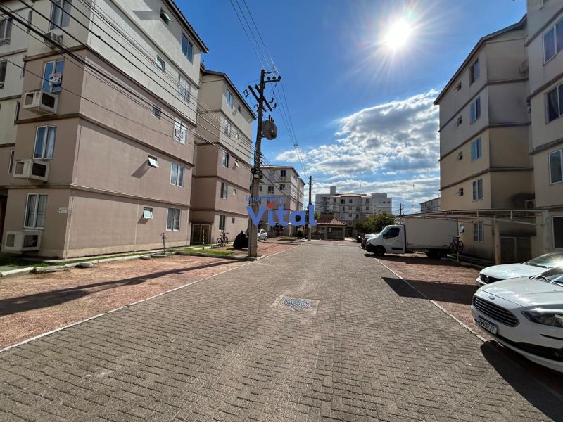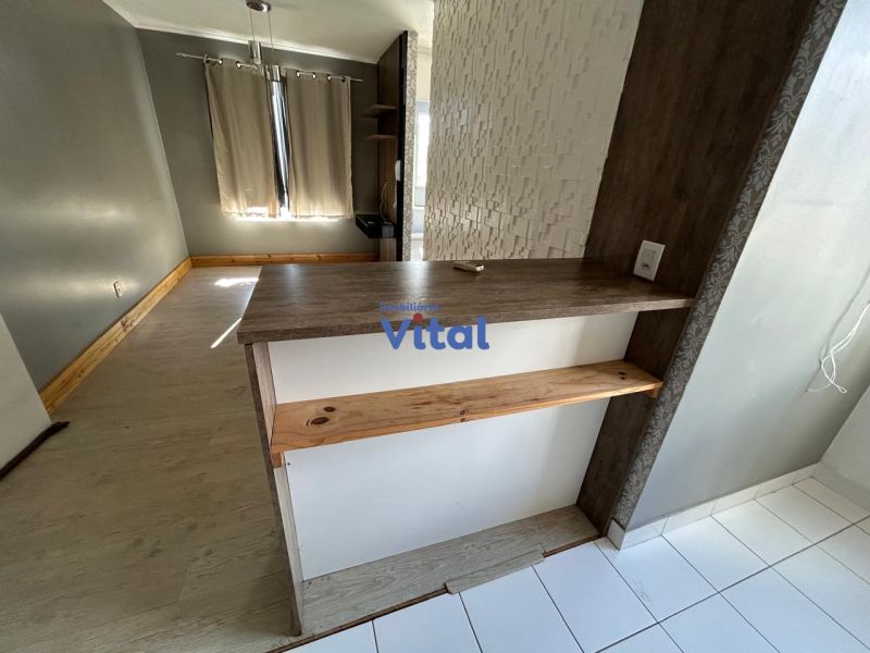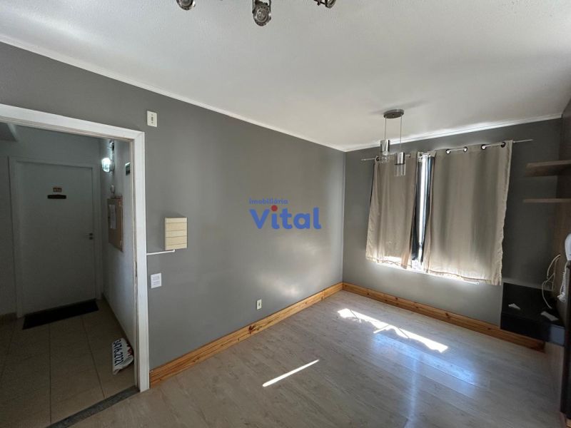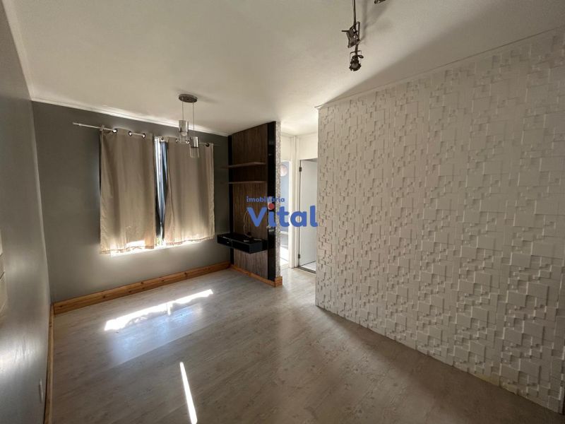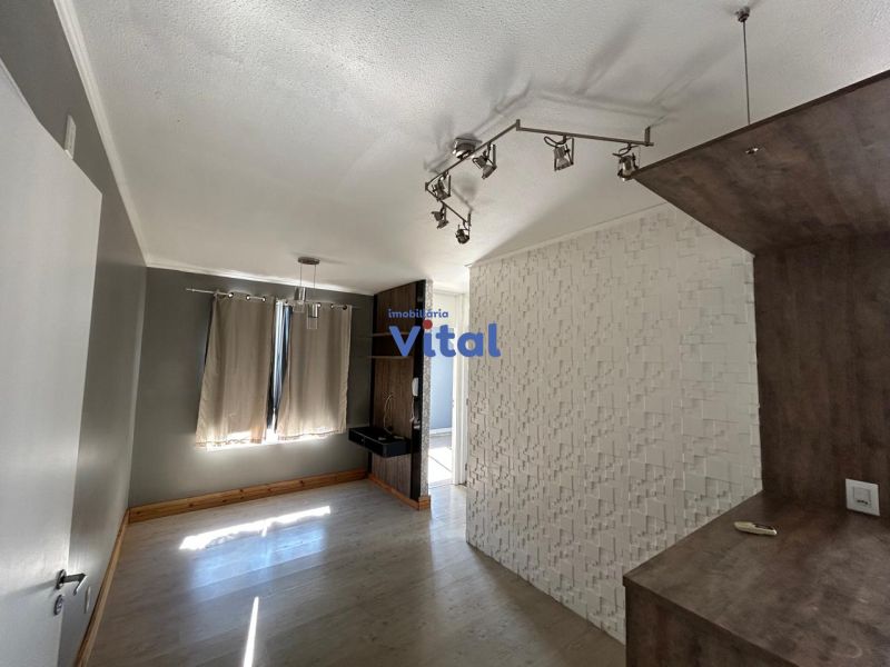 Apartamento com 43m², dois dormitórios, um banheiro, sala, cozinha, área de serviço e box para carro.