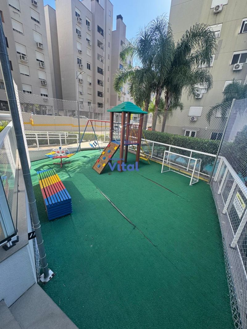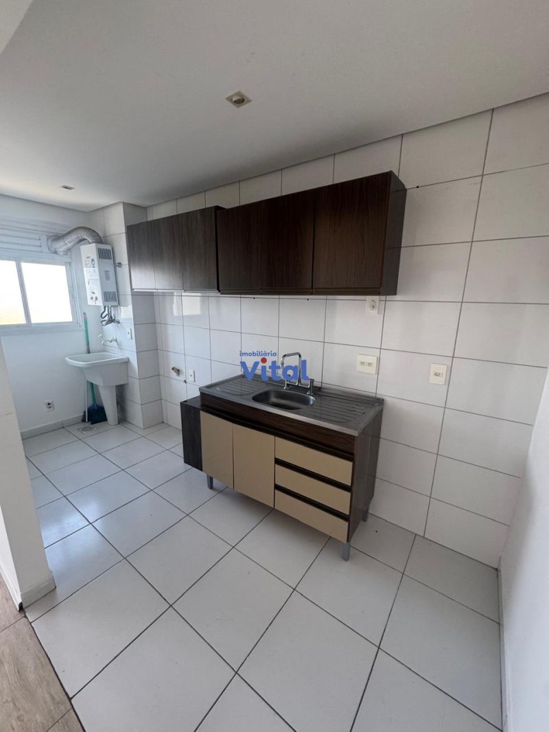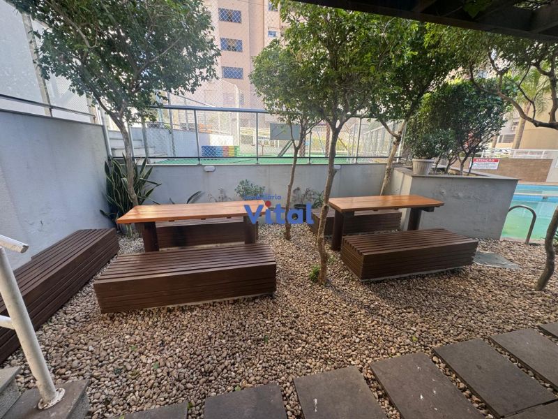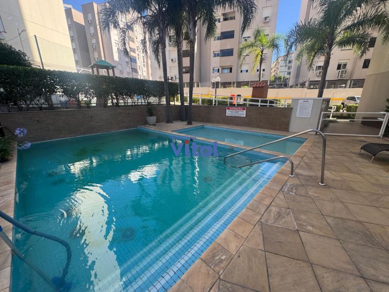 Apartamento com 64m², com dois dormitórios (um sendo suíte), dois banheiros, sala de estar / jantar, cozinha, área de serviço e box descoberto para carro. Condomínio com portaria 24h, salão de festas, quiosque com churrasqueira, piscinas adulto e infantil, espaço fitness e playground.