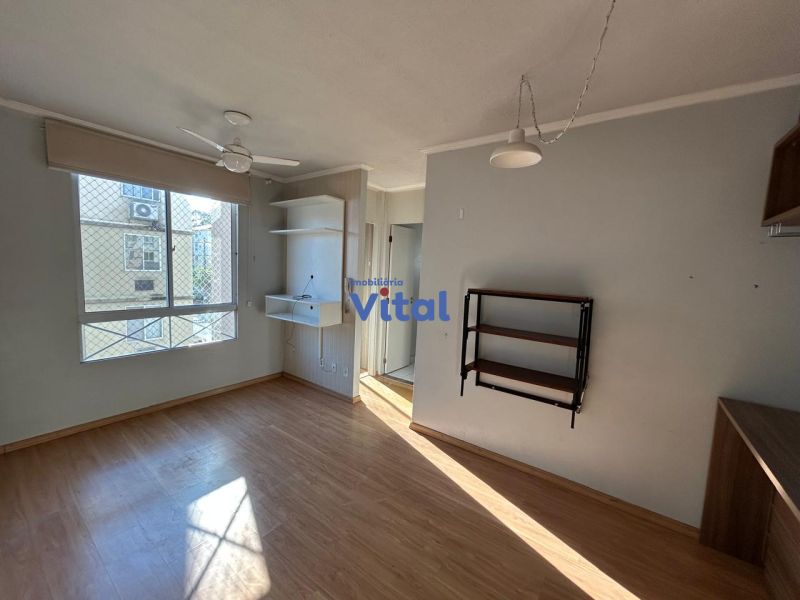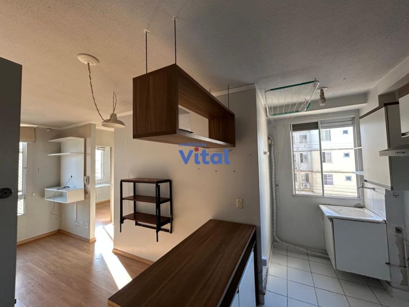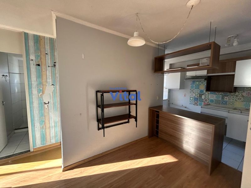 Apartamento semimobiliado, com 43m³, com dois dormitórios, um banheiro, sala, cozinha e área de serviço.