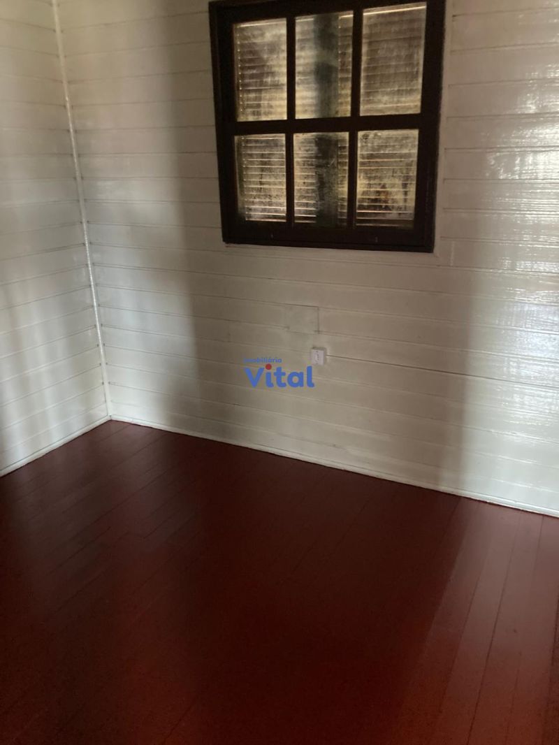Casa de madeira, com 50m², com dois dormitorios, um banheiro, sala, cozinha, area de serviço e garagem.