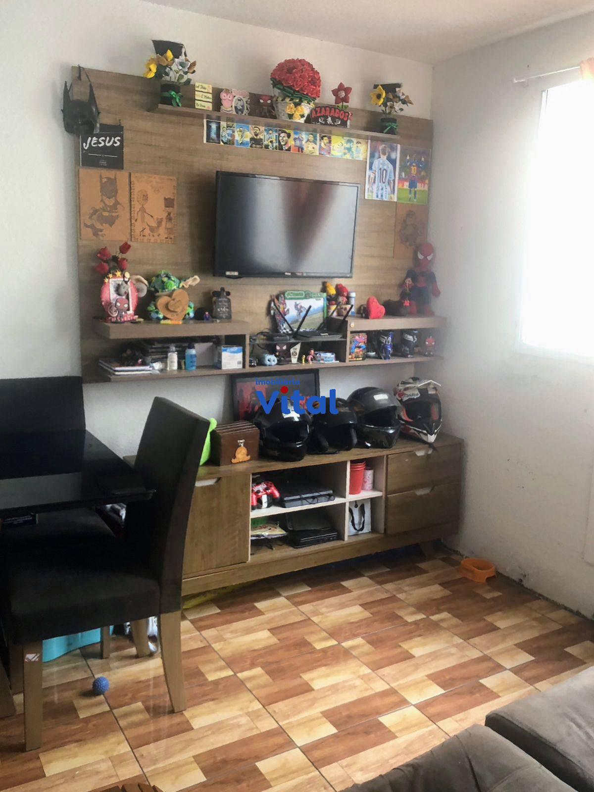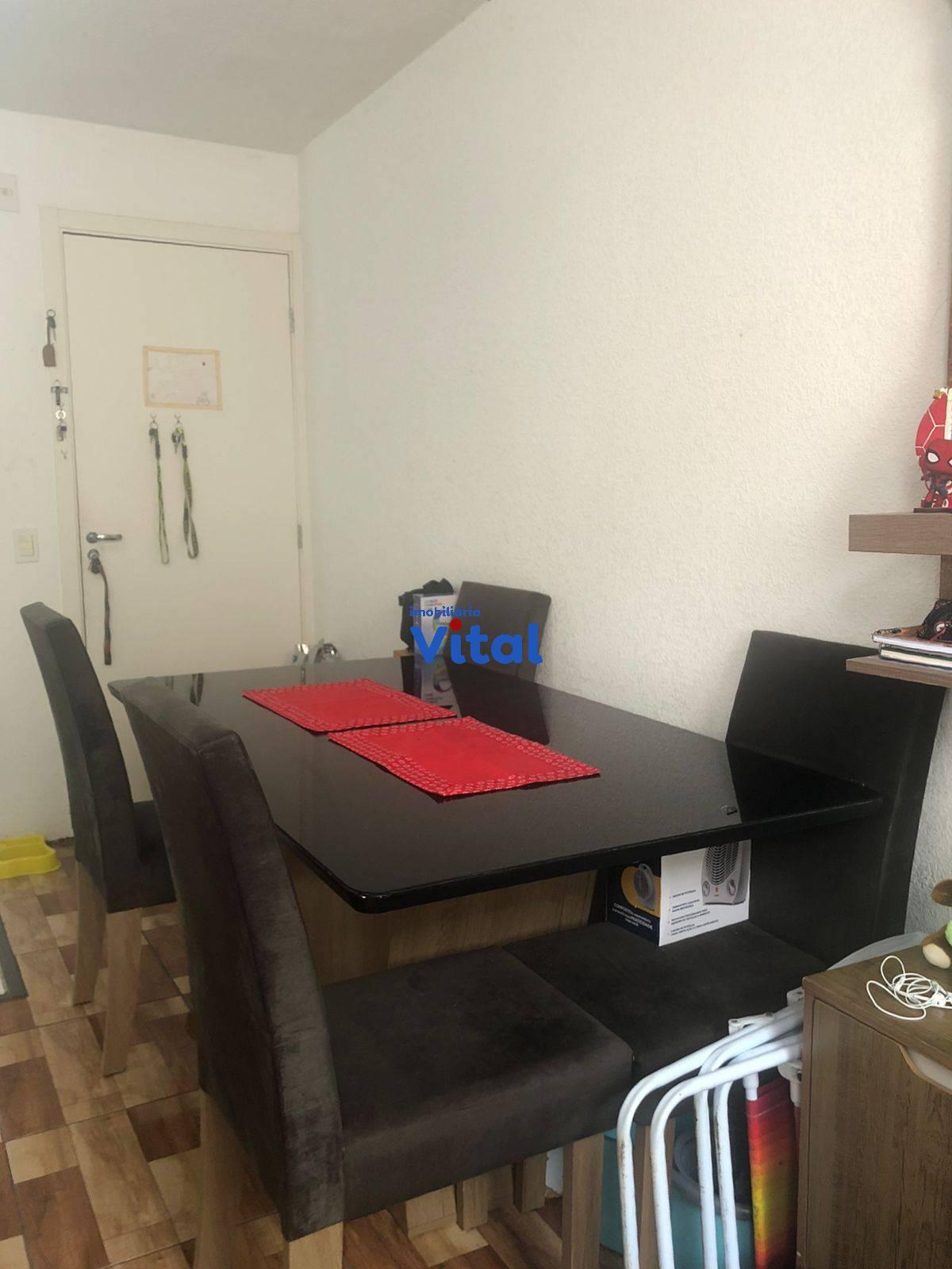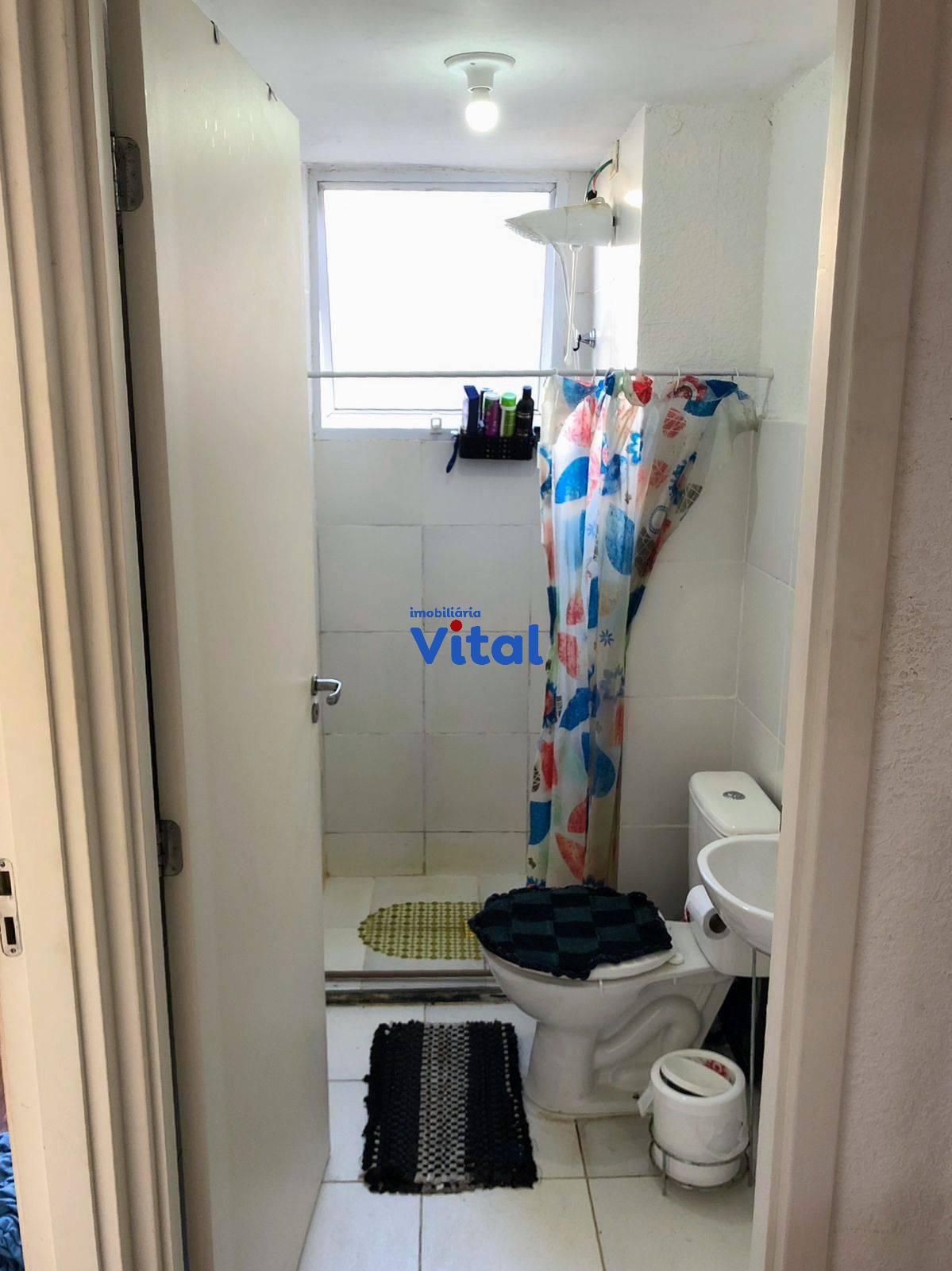 Apartamento com dois dormitórios, sala de estar integrada com cozinha e área de serviço, banheiro social e vaga de garagem rotativa. O condomínio possui portaria 24h, salão de festas, playground, quadra esportiva e quiosque com churrasqueira.