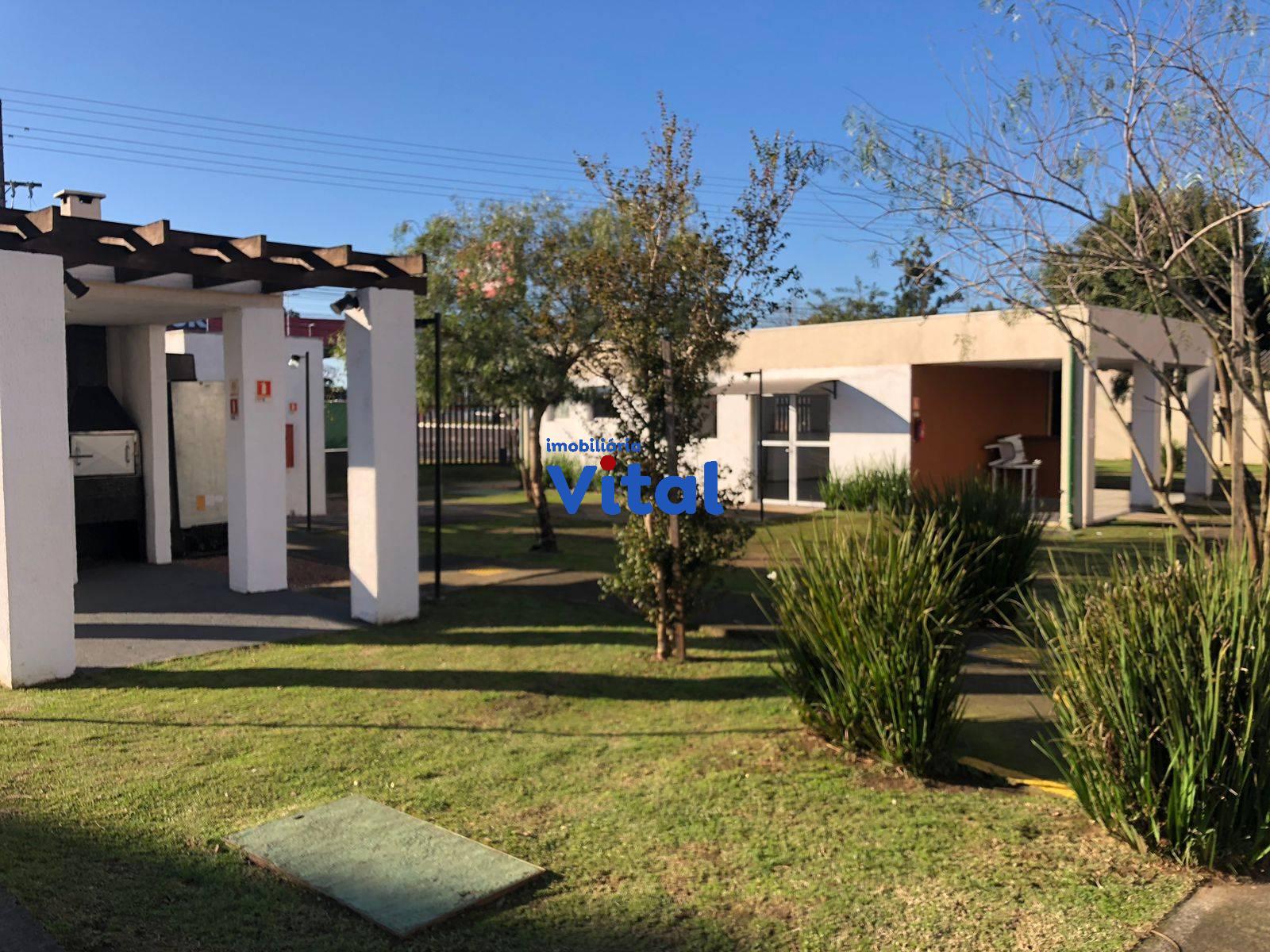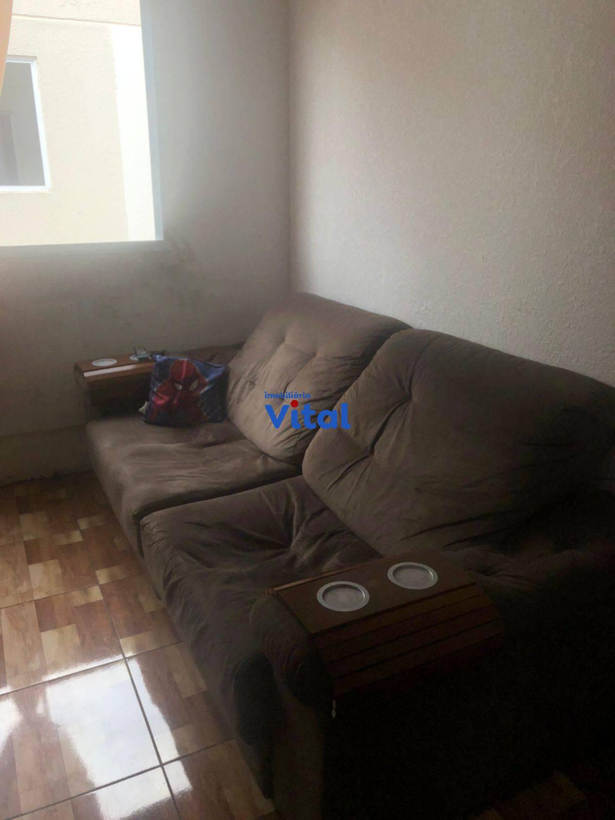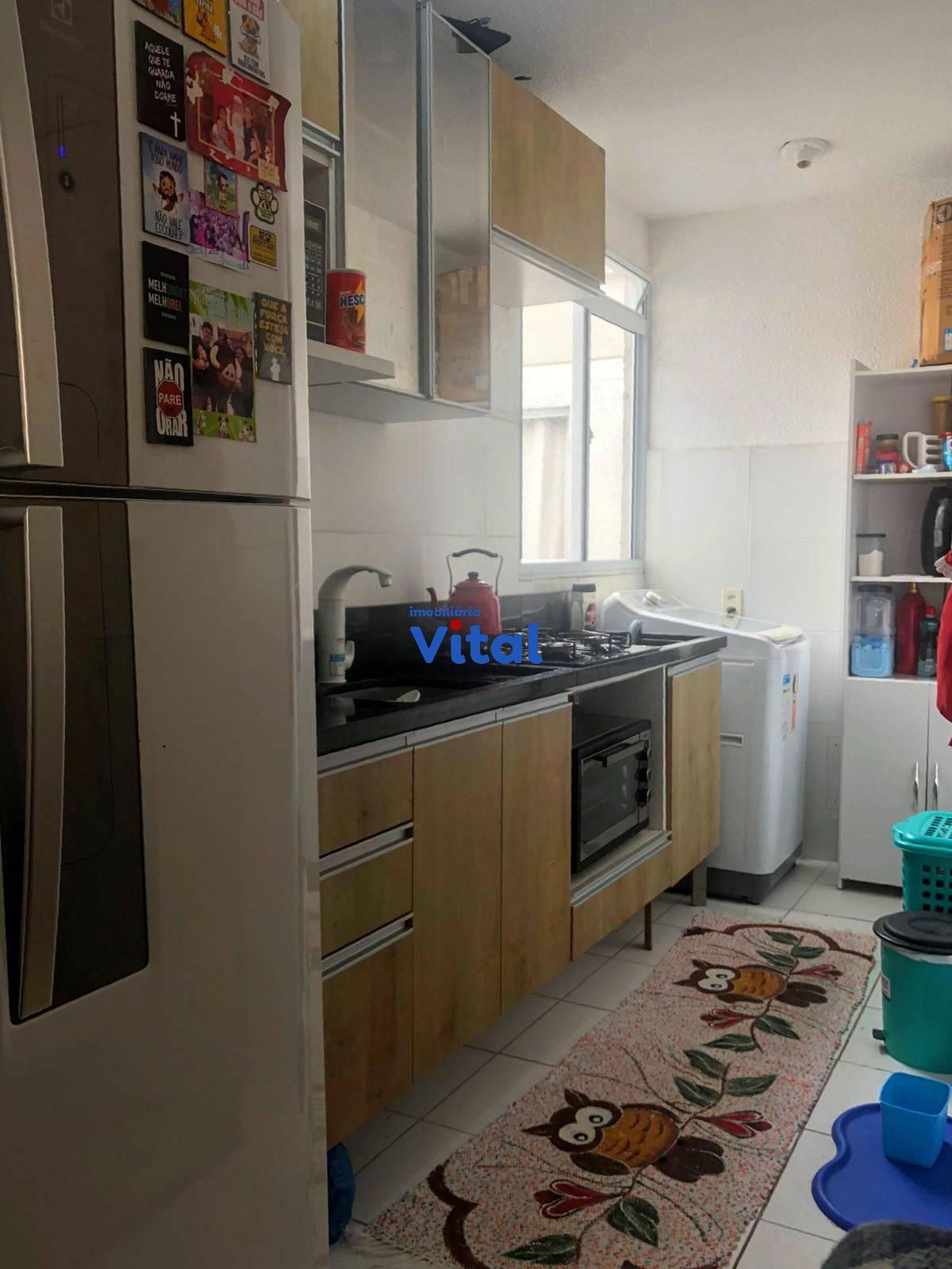 Apartamento com dois dormitórios, sala de estar integrada com cozinha e área de serviço, banheiro social e vaga de garagem rotativa. O condomínio possui portaria 24h, salão de festas, playground, quadra esportiva e quiosque com churrasqueira.