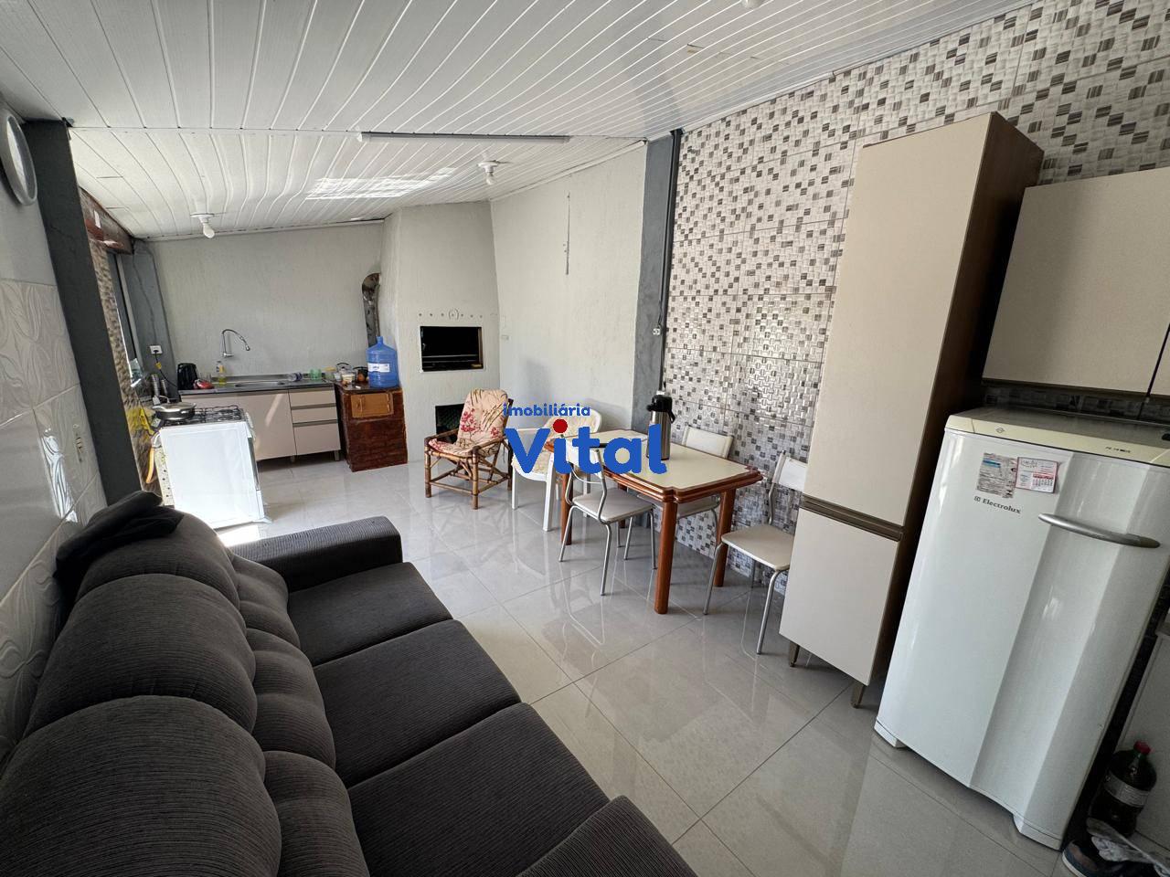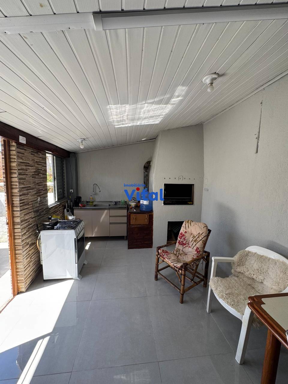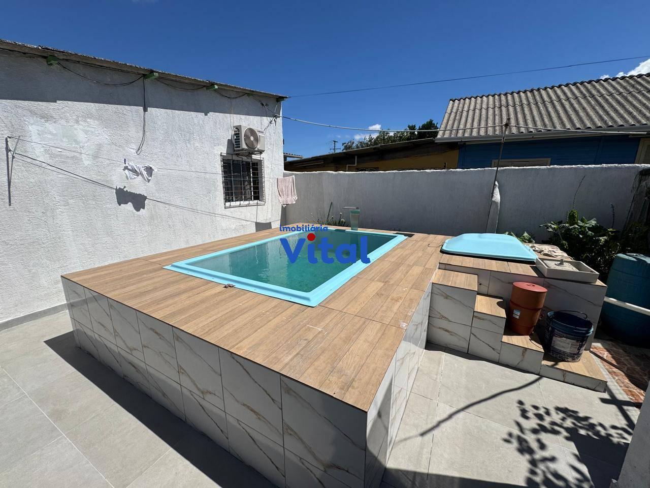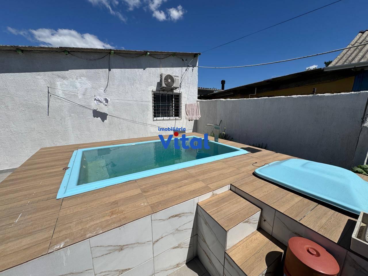 Casa de alvenaria com dois dormitórios, sala de estar, cozinha, banheiro social, área de serviço, garagem para dois carros e uma piscina. Há ainda uma área gourmet nos fundos com churrasqueira, banheiro e mais um dormitórios. Terreno de 400m² (10m x 40m).