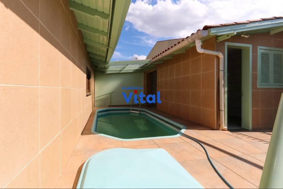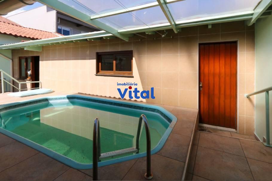 Excelente casa com 2 dormitórios, sala de estar com mezanino, sala de jantar com lareira, cozinha, dois banheiros, área gourmet com churrasqueira, piscina, área de serviço e garagem para até quatro carros. Imóvel possui aberturas em madeira nobre, cerca elétrica, alarme e ar condicionado no quarto.