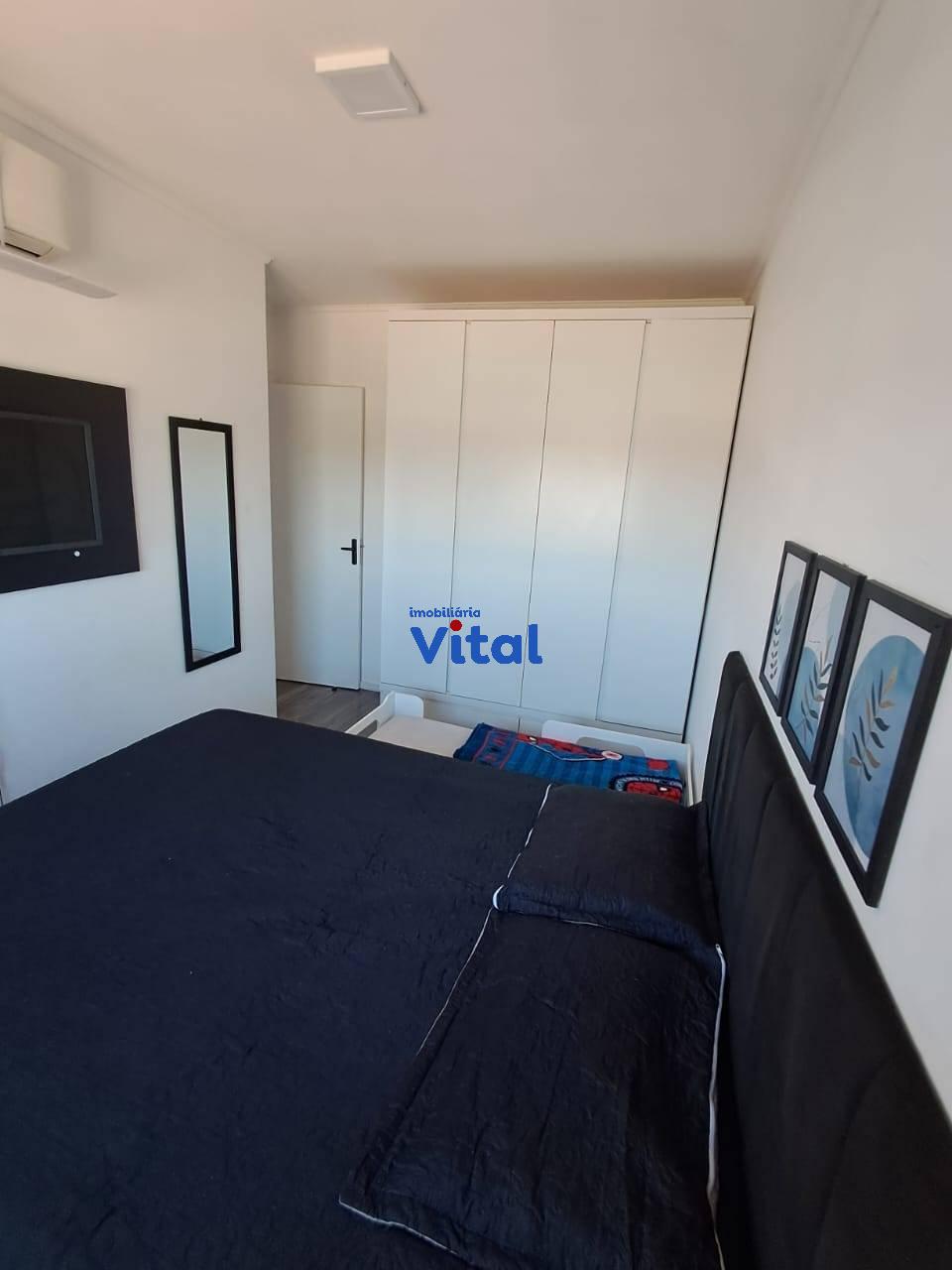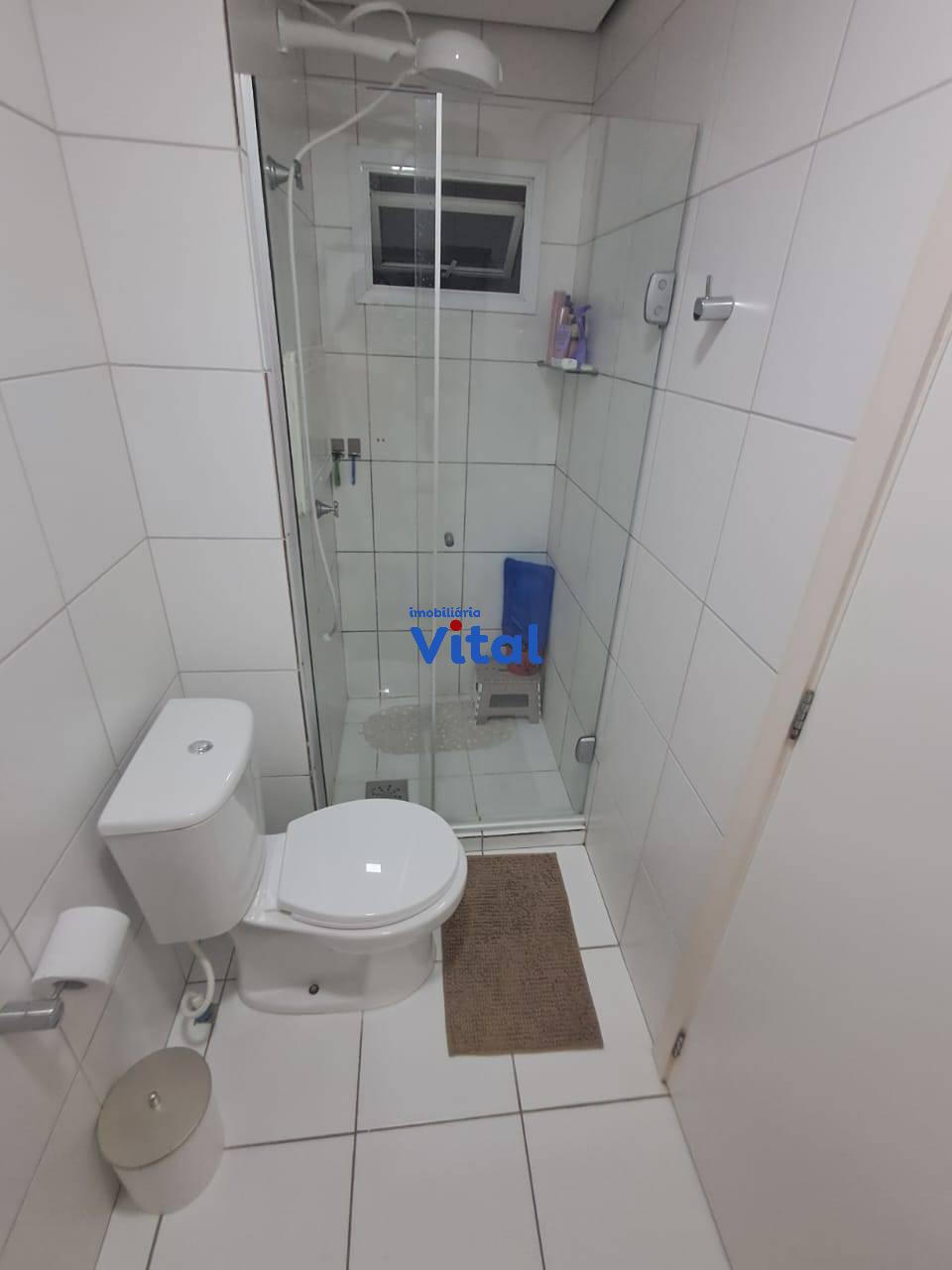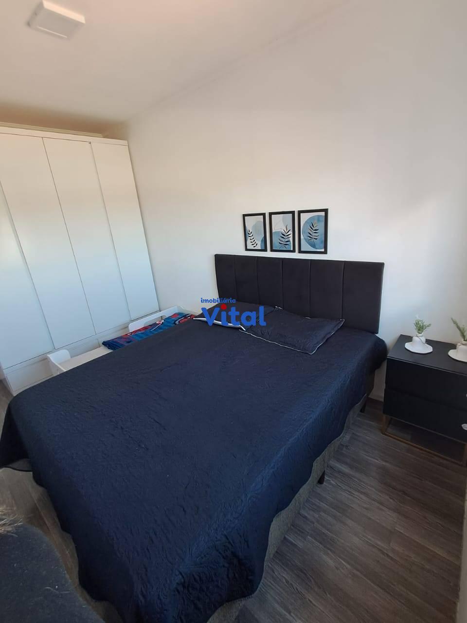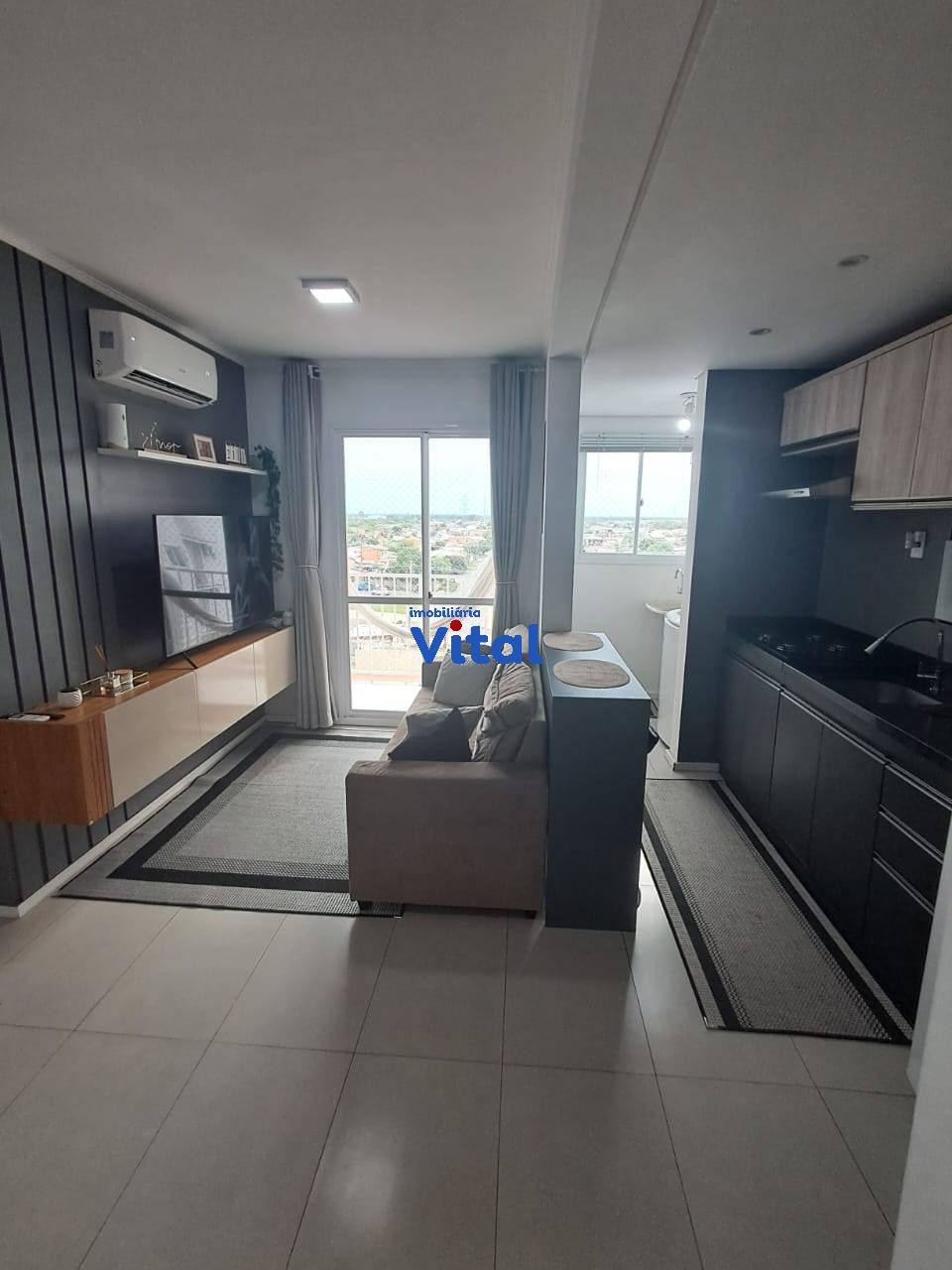 Excelente apartamento com dois dormitórios, sala de estar, cozinha planejada, banheiro social, área de serviço e duas vagas de garagem. Ficam todos os móveis planejados e dois ar condicionados. O condomínio conta com portaria 24h, dois salões de festas, quadra esportiva, mini-mercado, espaço pet e playground.